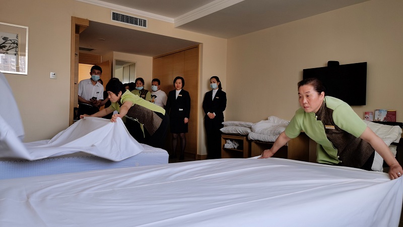 在疫情逐漸向好的大環(huán)境下,酒店入住率在緩步提升,在客房入住周轉頻率較高的情況下,快速鋪床能力顯得尤為重要。各位參賽的員工秉承著(zhù)“高境界、高起點(diǎn)、高標準”的做事理念為顧客提供舒適的入住環(huán)境。比賽時(shí)客房部其他員工全程觀(guān)摩,互提意見(jiàn)建議。最終劉萍用時(shí)“2分51秒,總成績(jì)90.5分”獲得冠軍。